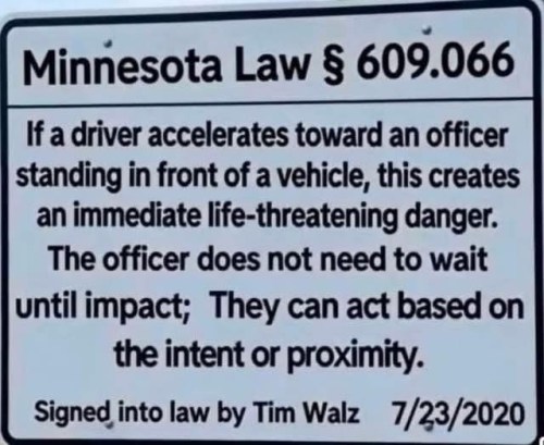 MINNESOTA: What the statute actually says is, “the use of deadly force by a peace officer in the line of duty is justified only if an objectively reasonable officer would believe, based on the totality of the circumstances known to the officer at the time and without the benefit of hindsight, that such force is necessary: