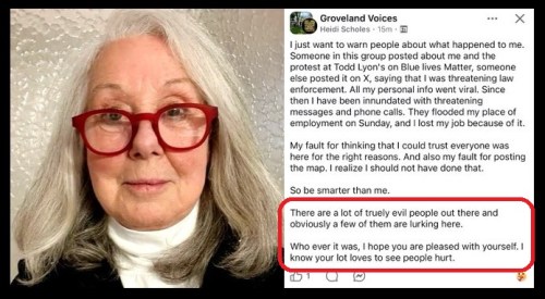 ZERO SELF-AWARENESS: Heidi Scholes, of Groveland, Massachusetts, posted the home address of the ICE Director all over the internet, encouraging protesters to head to his house and target his wife and children. She’s really angry that “evil people” who “love to see people hurt” doxxed her for her post!