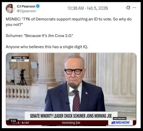 VOTER ID: Actually, it is not Schumer’s IQ that is the problem. It’s his lying tongue. Jim Crow (literacy) laws were passed by Democrats to keep newly freed, mostly illiterate slaves from voting, not because they were black, but because they overwhelming supported “the party of Lincoln” – i.e., the Republican Party. If illegals and other cheaters were voting Republican, Democrats would be demanding voter id.