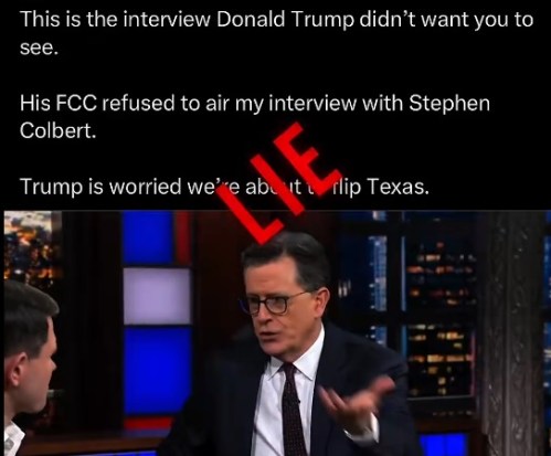 CBS: CBS announced the interview did not air, because it would have triggered “the FCC equal-time rule for two other candidates, including Rep. Jasmine Crockett.” Colbert reportedly didn’t want to have Jasmine Crockett on his show.