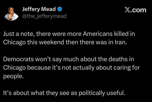 DEMOCRATS: They showed their moral bankruptcy last month when they were all up in arms about Renee Good and Alex Pretti, but had crickets to say about the tens of thousands of peaceful protesters the Iranian regime was slaughtering.