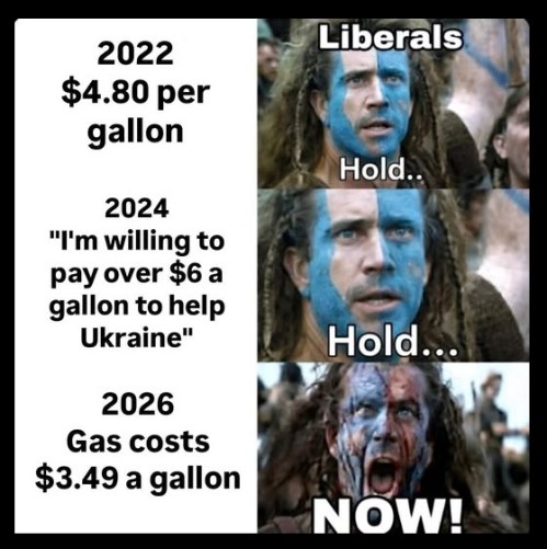 GAS PRICES: Libs who were fine with higher gas prices when Biden was in office are fuming that Trump’s war on Iran is causing a temporary spike.