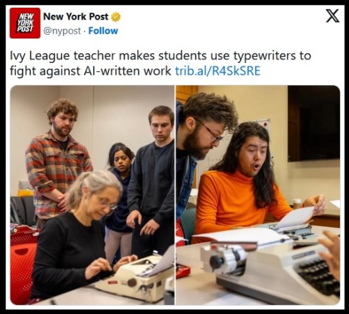 EDUCATION: Finally, some good news out of my alma mater! A Cornell University German teacher got fed up with her students turning in homework assignments that had been translated by ChatGPT. So, she found a few dozen old manual typewriters in thrift shops and online marketplaces, and created what her syllabus calls an ‘analog’ assignment. Her students have to use them to do their homework.