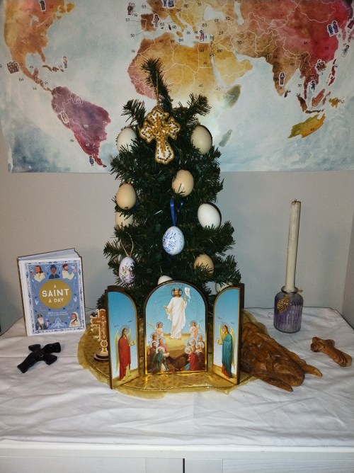 GRAMMY NOTES: The Mascots’ prayer table is decorated for the Easter season – i.e., the 50-day period between Easter and Pentecost.