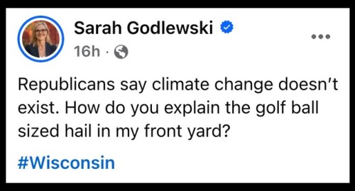 STUPID PEOPLE: Wisconsin’s Democrat Secretary of State thinks hail is evidence of climate change. FYI: Catastrophic hail events are mentioned in ancient texts from thousands of years before mankind began using fossil fuels. For example, in Joshua 10:11, it says the large hailstones that fell during a battle killed more Amorites than did Israelite swords.