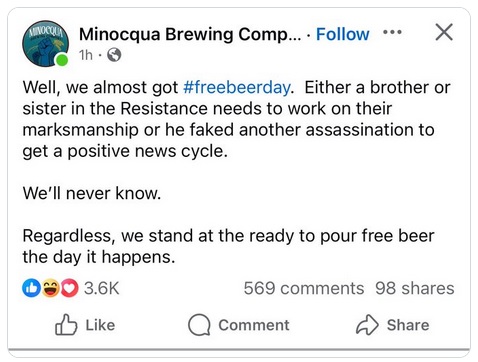 Minocqua Brewing in Madison, Wisconsin, has been promising “free beer all day” the moment someone kills President Trump. The owner of this brewery, Kirk Bangstad, is running for state office as a Democrat. He sells t-shirts and hoodies saying, “I wish it was free beer day at Minocqua Brewing Company,” “FDT,” “Abolish ICE,” and “Do your part. Punch a NAZI in the face.”