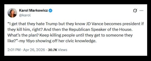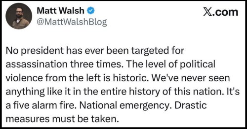 Babylon Bee writes, “‘This Is A Both Sides Issue,’ Says Side That Shot President Trump, Assassinated Charlie Kirk, Tried To Assassinate Kavanaugh, Tried To Shoot Trump Again, Shot Steve Scalise, Firebombed Governor Shapiro, Tried To Shoot Trump A Third Time … murdered schoolkids in Minnesota, murdered schoolchildren in Nashville, burned an elderly Jewish woman to death in Colorado, murdered a couple at the Jewish embassy in D.C., seized campus buildings and held janitors hostage, assaulted students on campus who appeared Jewish, ambushed ICE officers in Dallas and shot an officer in the neck, assassinated FBI officer David Underwood, assassinated the United Healthcare CEO, cheered the murder of over 1,200 civilians on October 7th, murdered schoolkids in Colorado in 2019, injured over 700 police offers in 2020 riots, murdered retired police captain David Dorn, murdered a 16-year-old boy in ‘CHAZ’, burned down Minneapolis, firebombed a Washington ICE center, murdered six people in Waukesha, assassinated five Dallas officers in 2016, assassinated three police in Baton Rouge in 2016 (you know what, we’re going to stop now, this is getting sad).”