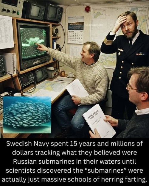 RED HERRINGS: During the Cold War, Soviety submarines illegally invaded Swedish waters, so the Swedish Navy took every underwater acoustic signal anomaly seriously. For 15 years, they were baffled by signals that looked exactly like a submarine, except it was somehow able to split into two, then four, then merge back together again. Sweden spent millions trying to figure out what was going on until, in 1996, civilian marine biologists analyzed the signals and informed the Navy they were biological. Specifically, herring. Herring communicate at night by releasing short bursts of air from their swim bladders, creating a distinctive “tick” sound. Large schools do this in synchronized patterns to stay together and those bursts perfectly mimicked submarine acoustic signatures on Sweden’s ultra-sensitive sensors.