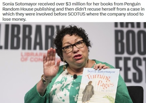 Now we learn that Justice Sotomayor took $3.6 million from a book company that did have business before the court at the time and did not recuse herself. Oops. Bonchie at Red States notes, “While the accusations against the conservative justices were silly and shallow, there is actual meat on the bone regarding what Sotomayor did.”