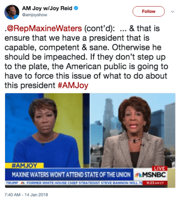 “Everywhere I go, people are talking about, ‘Why can’t y’all get rid of him? Why can’t you impeach him?’” Waters said. “They say all of these things and I’m not just talking about my district — whether I’m on the airplane, I’m walking down the street in New York, wherever I am — I’m hearing it.”