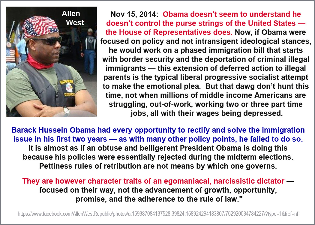 Just a few words about Obama’s naked power grab yesterday.I truly believe that almost unlimited power is driving him mad.He has a big,empty hole where his soul should be that all the lies,theft and pain he can inflict won’t fill.When you listen to his speech listing all the conditions for amnesty,no criminal record,must live here five years,blah,blah,blah,remember it all means NOTHING!No one cares if they meet the criteria or not,he desperately needs all the illegal votes he can get.Never mind the increased competition for jobs,the added pressure on social services or the increase in crime.As long as it helps him win,that’s all he cares about.I am thoroughly convinced there is no depth he won’t sink to,no law he won’t break in an effort to hang on to his power.We  must all pray and work to rid ourselves of this virus before the damage he does becomes irreparable.