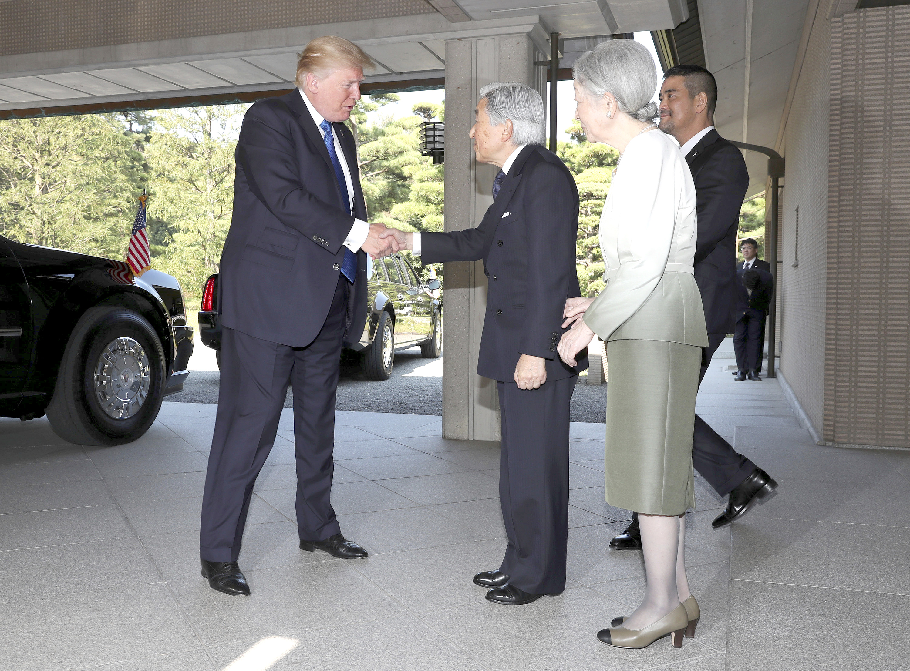 Trump greets Japanese emperor with a handshake and nod – but no bow U.S. President Donald Trump greeted Japanese Emperor Akihito and Empress Michiko on Monday with a genteel handshake and nod, but no bow, avoiding the pitfall of U.S. President Barack Obama who was criticized at home for his deep bow to the monarch.
