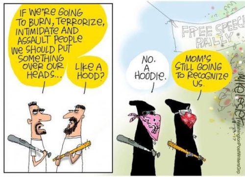 Today is a day we face with some trepidation. The mighty forces of the Antifa liberators are planning to appear in a number of cities across America in a show of force. They will don their hankies so their moms won’t know what they’re doing when they sneak out of the basement with their bottles of urine and Army surplus gas masks. One certainty is the press will pay far more attention to these pussies than they have the primary rigging, Uranium One, and the Menendez corruption trial.