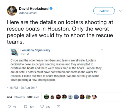 Now Houston is flooded, the city is expecting more rain, looters are ransacking stores, and people are dying. And it’s only going to get worse.