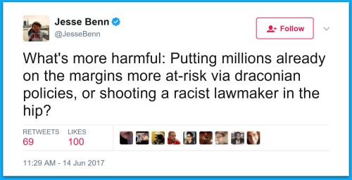 Huffington Post Contributor: What’s Worse? Cancelling Obamacare Or Shooting A Racist Lawmaker In The Hip?