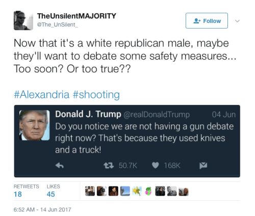 Filed under Antifa, Bernie Sanders, Chris Matthews, Crime, Democrats, Donald Trump, Loretta Lynch, Media Bias, Republicans, Sarah Palin, Steve Scalise