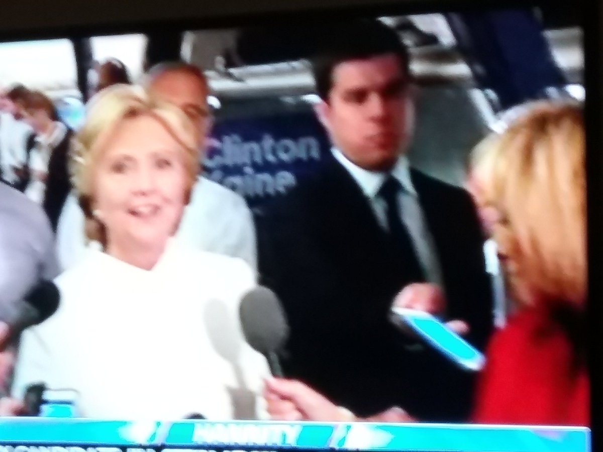 Standing behind Clinton, Merrill can be seen pushing his smartphone past Clinton into the face of NBC News reporter Andrea Mitchell who looks down to read the message on Merrill’s phone. Merrill makes intense eye contact with Mitchell and cracks a furtive half-smile at her.
