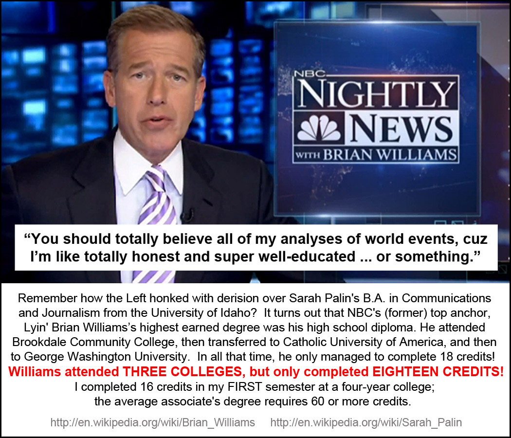 Feb 2015: Brian Williams Apologizes, Recants Iraq Story – MSNBC [5:28] — Oh my goodness. Williams’ self-aggrandizing fake story was allegedly all about honoring the military. Riiiiiiiiiiiiiiiiight.