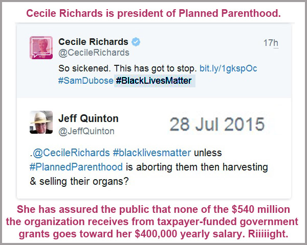 How do we know this? Easy. Just imagine what could possibly make the situation more ripe for doing so – right now. A mere few months ago, no one could have imagined the complete and total havoc wrought on the reputation of Planned Parenthood by seemingly endless undercover tapes showing PP officials swigging wine and gloating about making a fortune selling intact baby parts that could only be obtained by harvesting in illegal (and horrific) ways. PP CEO Cecile Richards has been publicly forced to admit embarrassing things in front of Congress that strip virtually any remaining legitimacy from the organization.