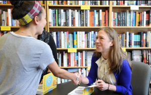Three girls stood at the head of the line behind Eight Cousins bookstore Thursday morning, clutching copies of “She Persisted,” a new children’s book by Chelsea Clinton.