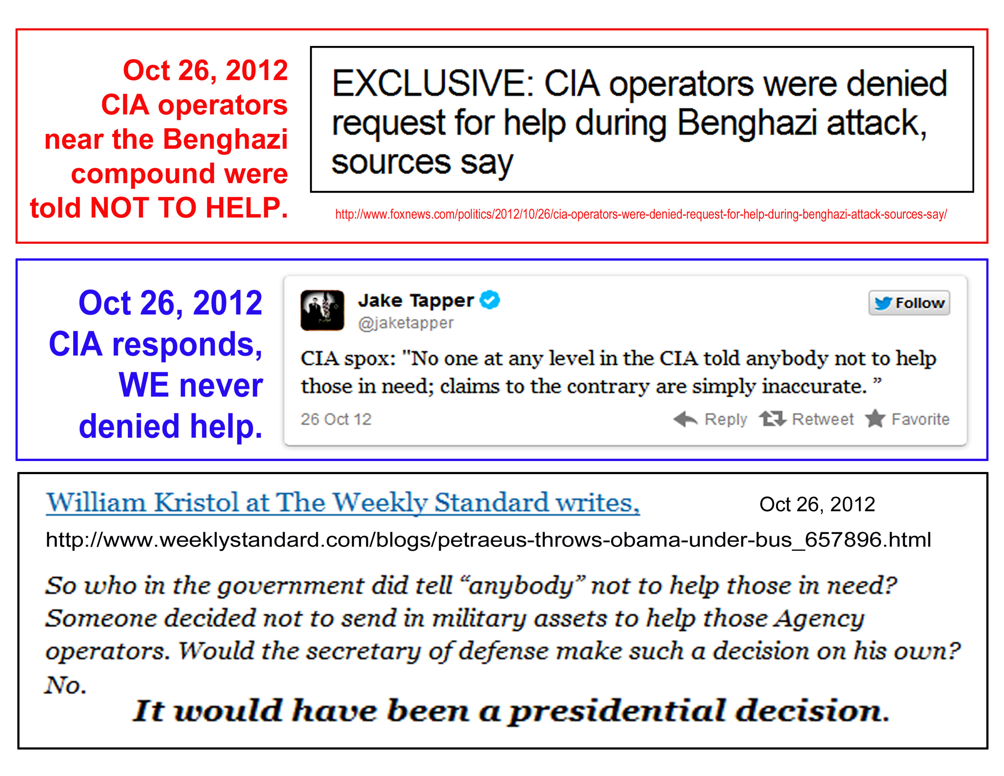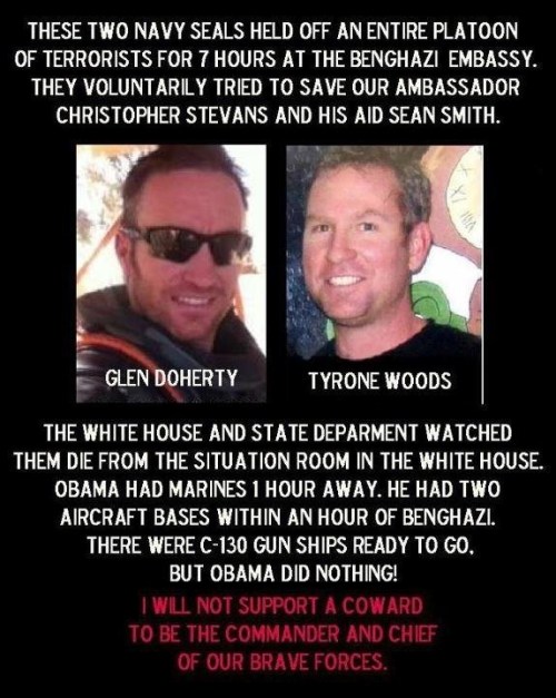 2012 October 26: Fox reported that three urgent requests for military assistance for the Benghazi consulate were sent from the CIA annex. SOMEBODY told the CIA operators they were to stand down. Two former Navy SEALS, Glen Doherty and Tyrone Woods, were at the CIA annex. They wanted to go help defend the consulate. They were ordered to stay put, but DISOBEYED that order. Both died heroically, trying to protect the ambassador and his staff.
