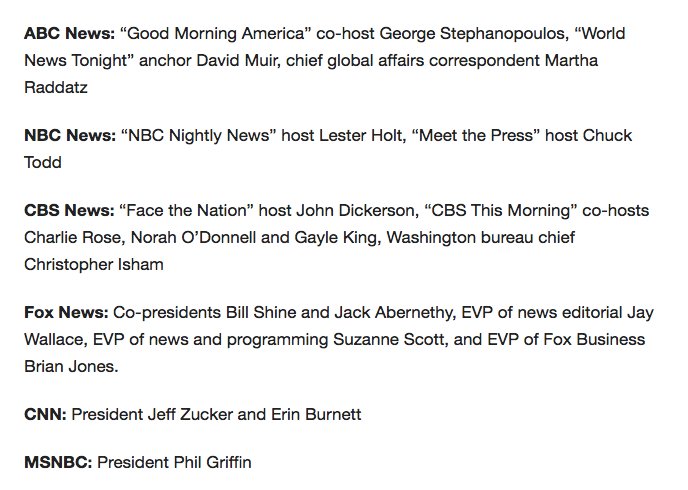 The hour-long session included top execs from network and cable news channels. Among the attendees were NBC’s Deborah Turness, Lester Holt and Chuck Todd, ABC’s James Goldston, George Stephanopoulos, David Muir, and Martha Raddatz. Also, CBS’ Norah O’Donnell John Dickerson, Charlie Rose, Christopher Isham and King, Fox News’ Bill Shine, Jack Abernethy, Jay Wallace, Suzanne Scott, MSNBC’s Phil Griffin and CNN’s Jeff Zucker and Erin Burnett.