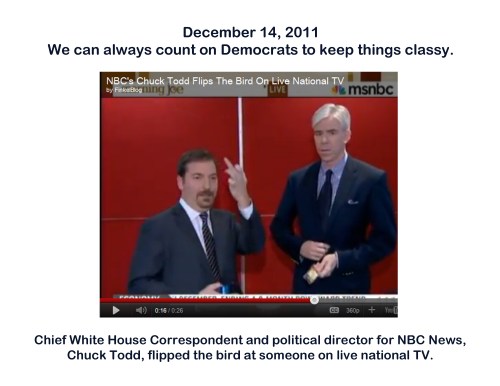 March 20, 2013: Chuck Todd of NBC News departs from the “Make Obama Look Good” script. Check out Obama’s face at :30. At the end, Obama sends Todd his famously immature and unpresidential middle finger “itch” sign. [1:46]