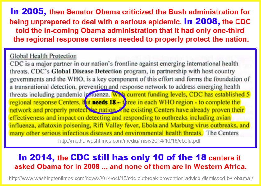 2014: October 3 – Three weeks after declaring the Ebola outbreak a “national security priority”, Obama continued to refuse to ban travel into the U.S. for people who have been in affected West African countries. He has the legal power to impose such an emergency measure.