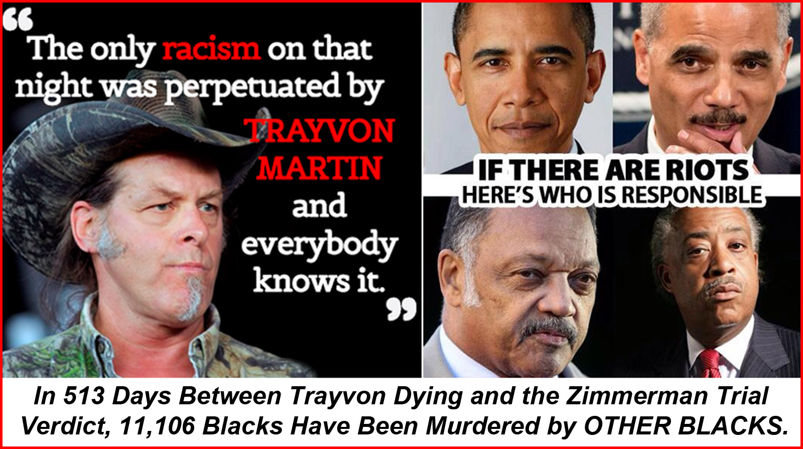 And so it was for a few weeks until the race-baiting industry saw an opportunity to further the racist careers of Al Sharpton, Jesse Jackson, the Black Panthers. President Obama and Attorney General Eric Holder, et al, who then swept down on the Florida community refusing to admit that the 17-year-old dope smoking, racist gangsta wannabe Trayvon Martin was at all responsible for his bad decisions and standard modus operendi of always taking the violent route.