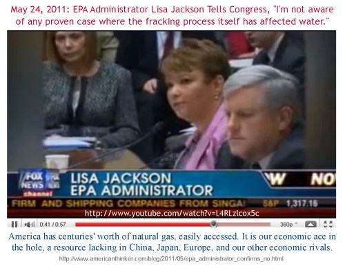 And former Environmental Protection Agency [EPA] Administrator Lisa Jackson told Congress she was “not aware of any proven case where the fracking process itself has affected water.”