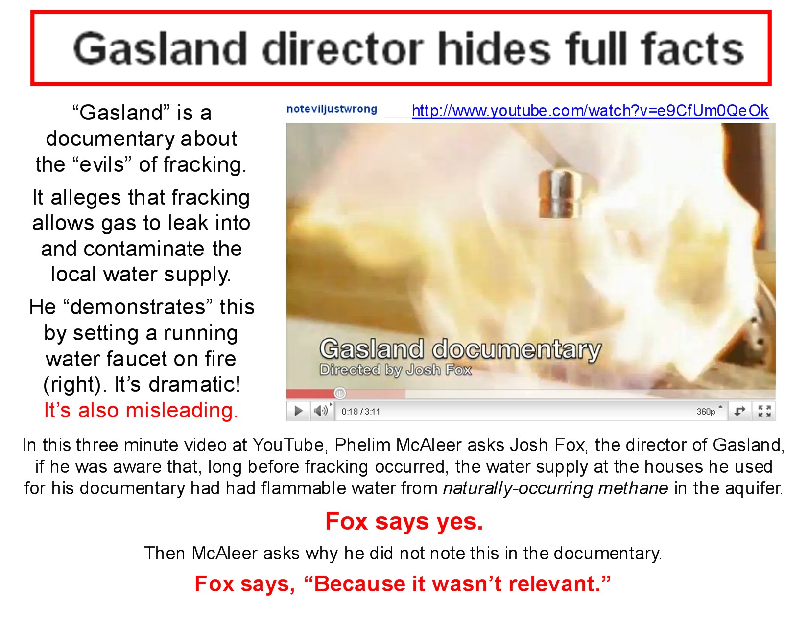 You may or may not have heard of the anti-fracking movies “Gasland” and “Gasland II”” by Josh Fox. The fake “David and Goliath” myth about him is presented uncritically at the beginning of this trailer as absolute fact.
