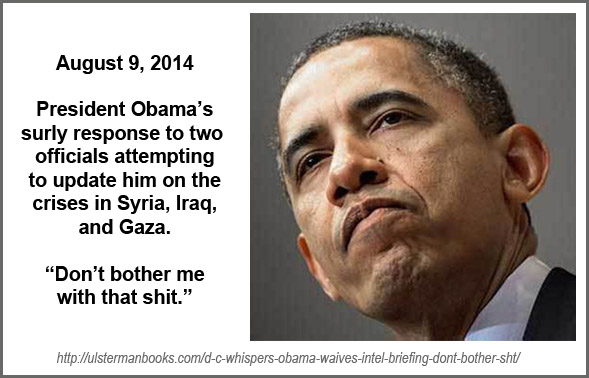 - August 30, 2014: Obama’s Press Secy clarifies “we don’t have a strategy” @ http://www.ijreview.com/2014/08/172724-u-s-war-isis-white-house-press-secretary-gives-interesting-answer/