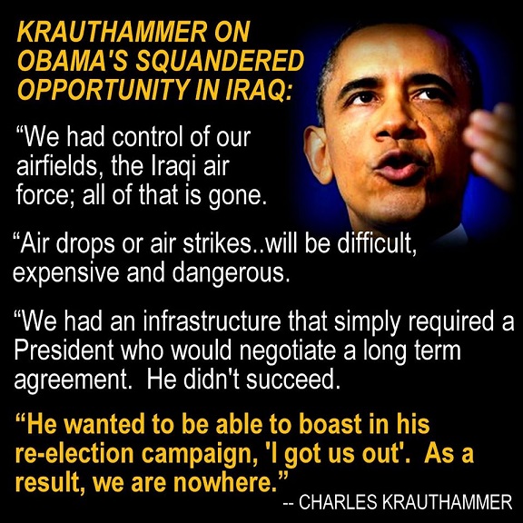- June 11, 2014: OBAMA’s Press Secretary condemns attacks by ISIS, offers condolences to the families of those killed, and underscores Obama’s commitment to limit U.S. involvement to primarily diplomatic encouragement to Iraqi leaders to fix their own problems.