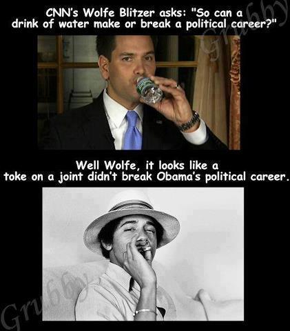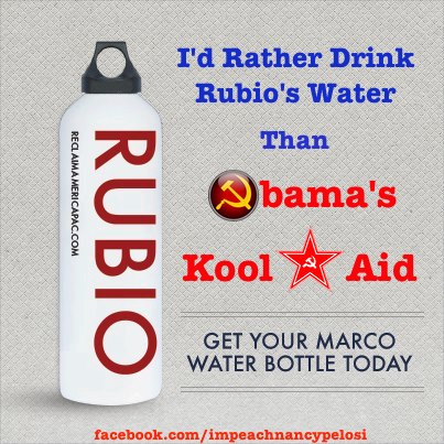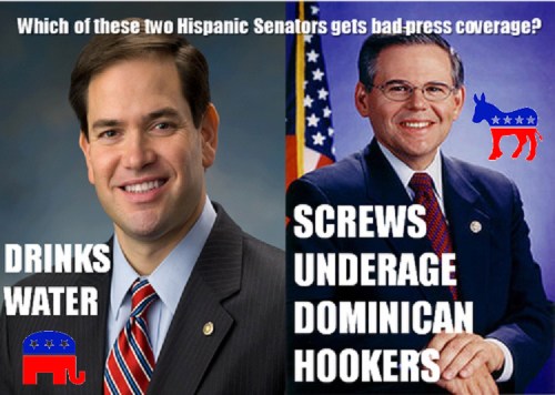 The meme was that his awkward pause to wet his whistle was going to End His Career! (They wish. It gripes ’em No End that the Hispanic Senator from Florida is … gasp … a Republican.)