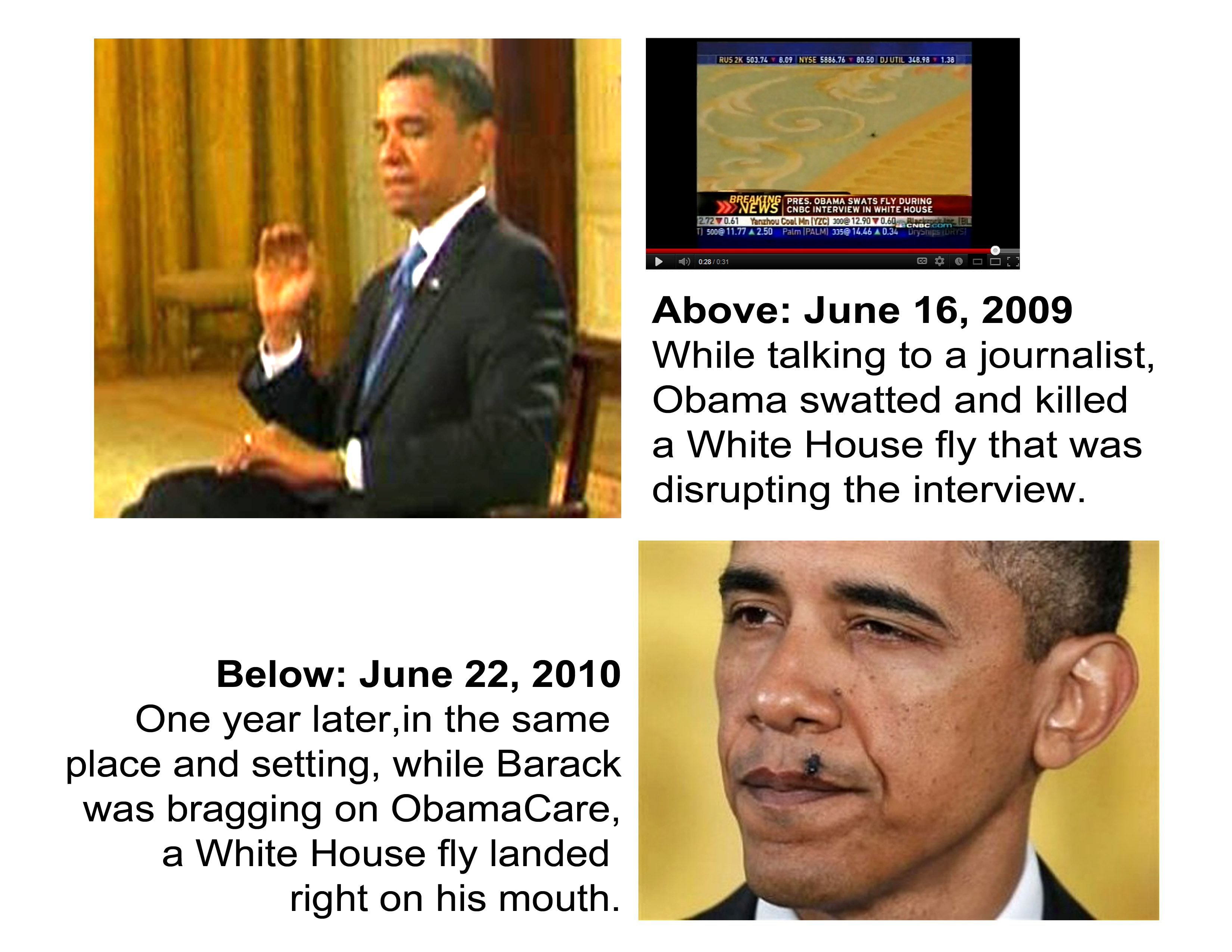 On June 22, 2010, in the SAME place and the SAME setting, while Barack was bragging on ObamaCare — which he had signed into law March 23, 2010 — a White House fly landed right on his mouth.