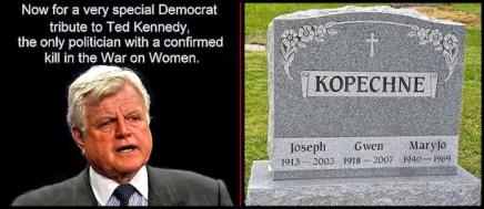 A film about his killing of an innocent woman was released last week. In full disclosure, I have not, nor do I intend to see this movie. It comes 50 years too late and hardly mentions Mary Jo Kopechne, his victim. There is a meme going around that in the War on Women, Kennedy is the only one with a confirmed kill. This is not funny. It is a fact.