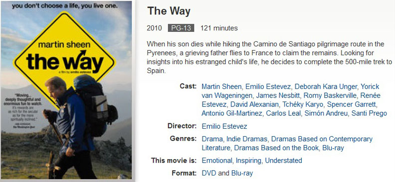 They filmed it on the Camino, so there’s scenery, culture, religion and history, if you like that kind of thing. It’s gender-neutral with that “going from here to there” thing that guys seem to enjoy combined with the “characters in a slice of life” thing that gals seem to prefer. Zero action, sex, violence, language. A little bit of mild drug, drink and smoking. Very respectful of personal faith issues.
