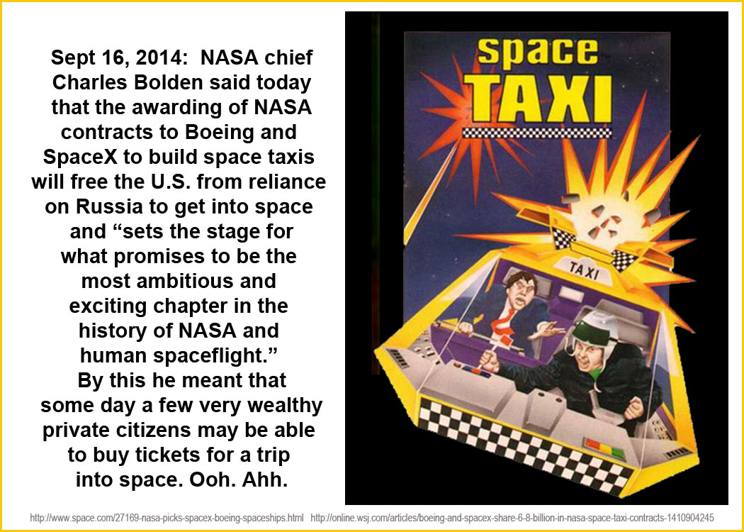 Sept 16, 2014: NASA has awarded contracts to Boeing Co. and SpaceX to design and build space taxis to carry U.S. astronauts into orbit by 2017. Since our last space shuttle was mothballed in 2011, we have been dependent on Russia for space rides.