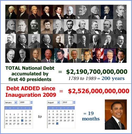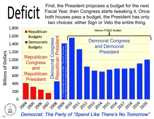 When Obama walked into the Oval Office, the 2009 budget that greeted him had been signed in 2008 by President Bush. But it had been passed by a Democrat-majority Congress, of which Senator Obama was a part. That budget contained a projected deficit of about $500 Billion.