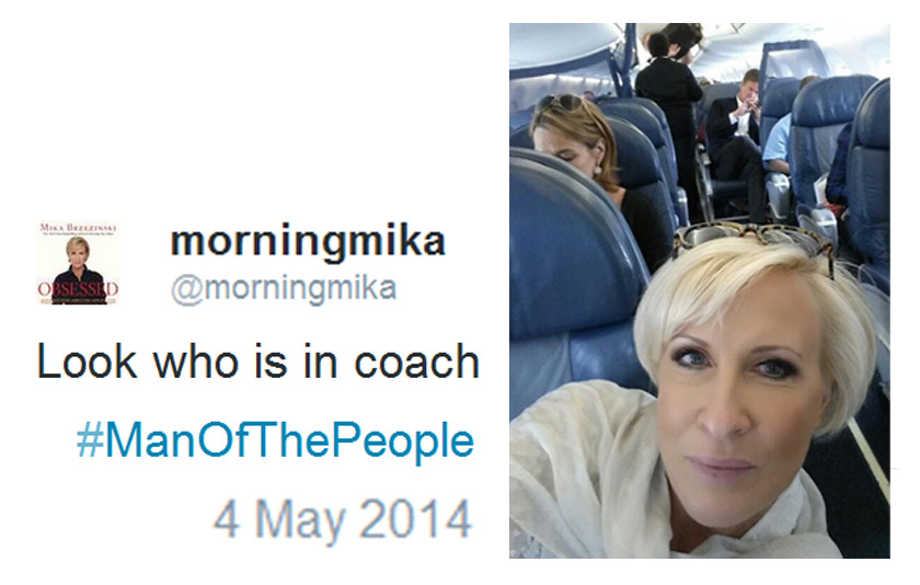Yesterday, Mika Brzezinski tweeted that she was “one of the people” because she was … GASP! … riding in COACH.