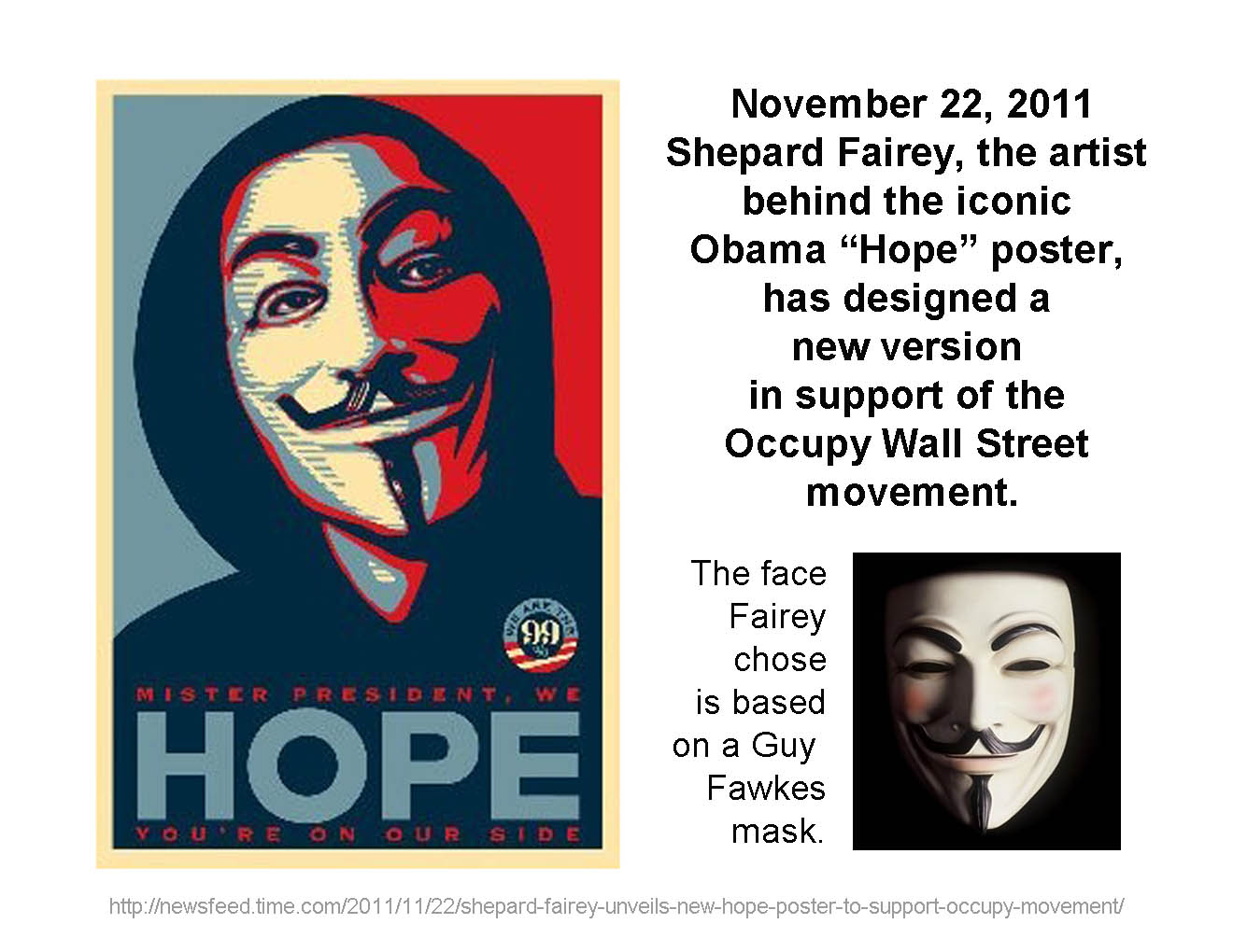 I was also intrigued by Fairey’s use of Guy Fawkes for the face of “Occupy.” It got me curious who Guy Fawkes really was. Here’s what I found: