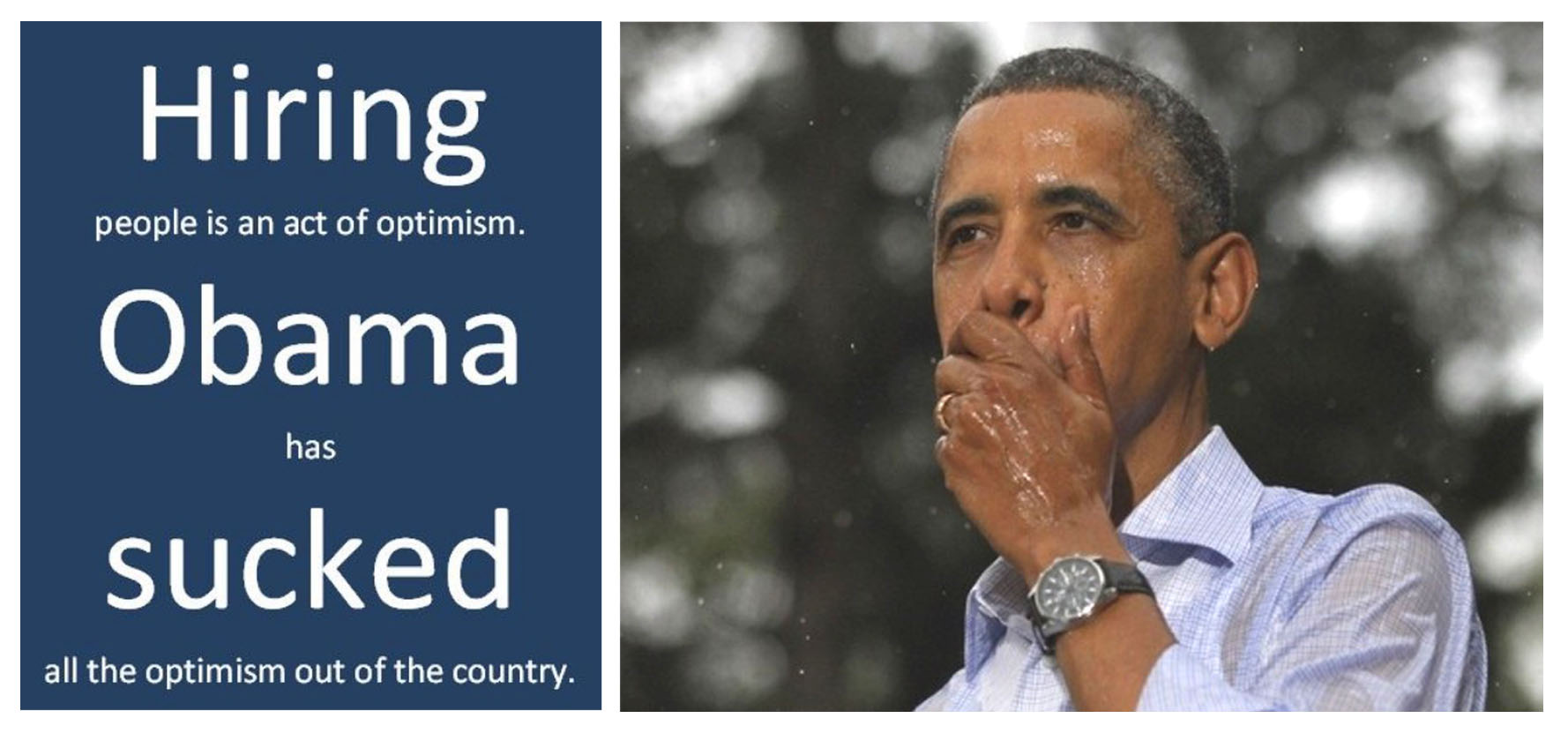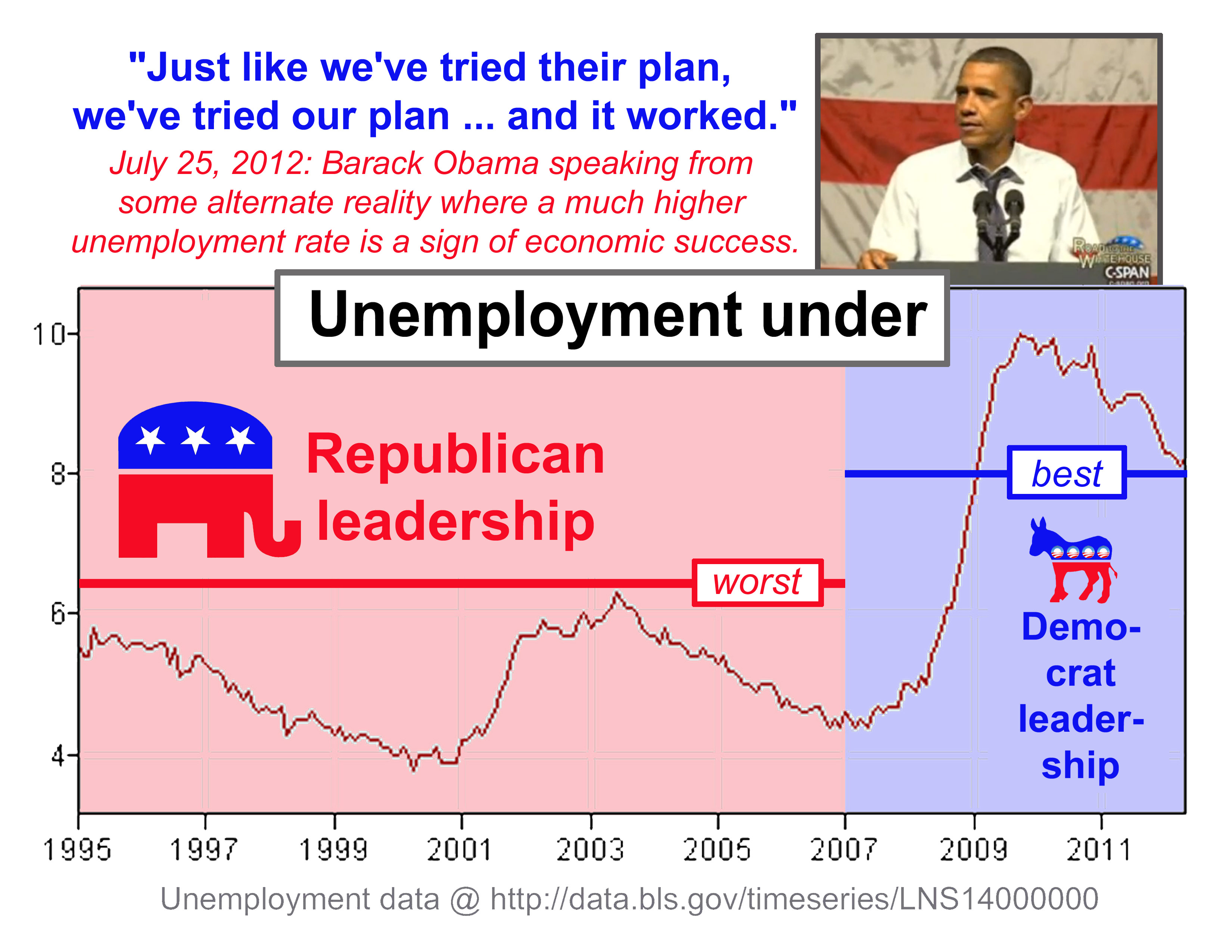 Me: Really? Tax cuts have worked every time they are implemented. During the 60’s with the Kennedy tax cuts; during the 80’s with the Reagan tax cuts and yes, even during the Bush years. Bush inherited a recession and then America got hit with 9/11/01. Our economy was hit with a double whammy. The unemployment under Bush never got as high as the lowest under Obama. In fact, by his own admission tax cuts work; he signed the extension of the Bush Tax Cuts in 2010 and during a Primary debate in 2008.