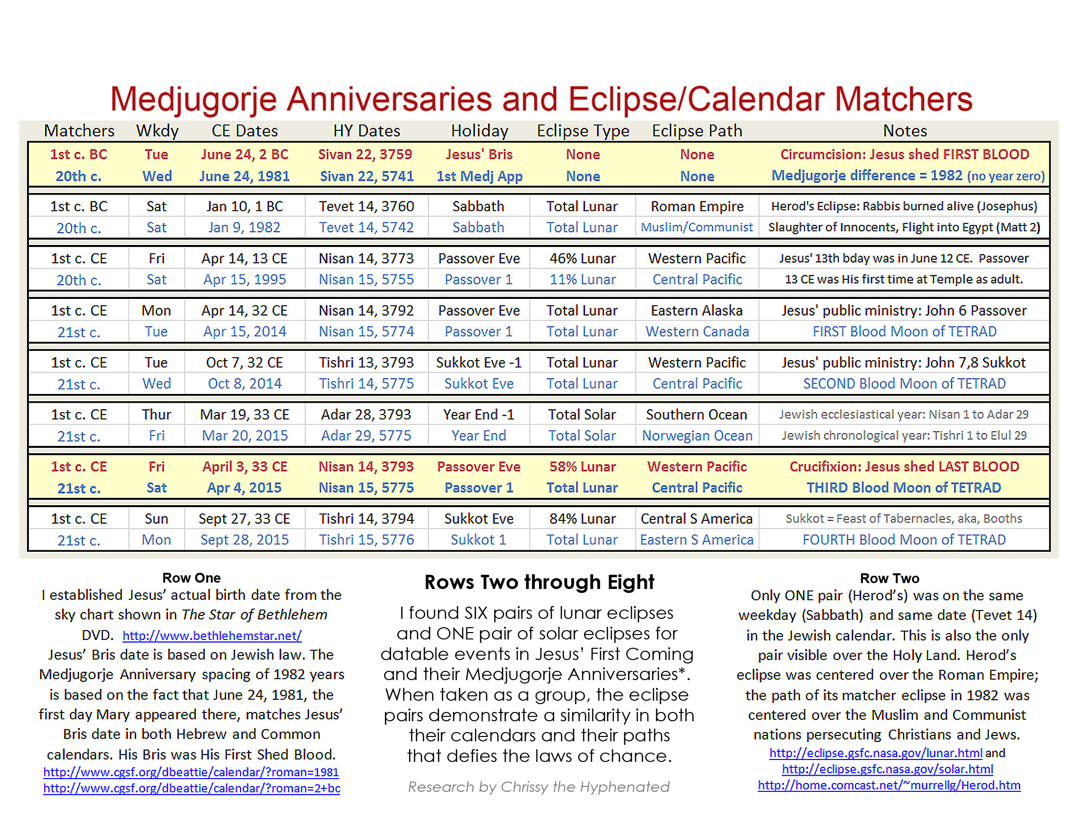 So far I’ve found Medjugorje matchers for the first three Blood Moons and the solar eclipse.