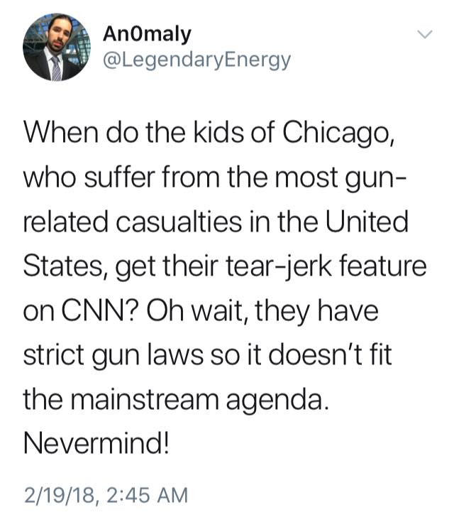 ALL THE COMMENTERS NOTICED THE LIGHTNING SPEED WITH WHICH MSN POINTED OUT THE SHOOTER WAS WHITE AND THE VICTIMS WERE BLACK. IT’S THE ONLY TIME RACE IS THE LEAST BIT RELEVANT.