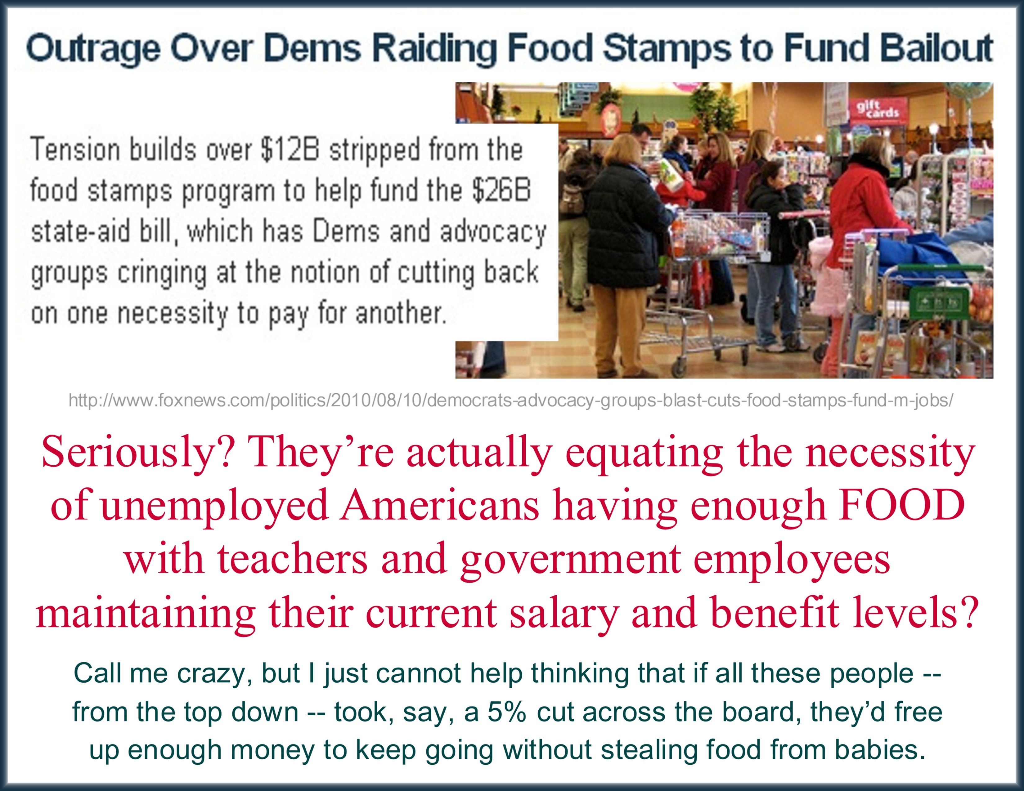 Republicans want to cut food stamp funding. Democrats will be sure to weep, wail and gnash their teeth about evil Republicans who want children and old people to starve.